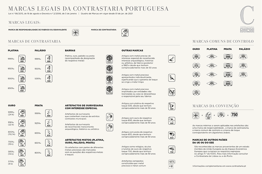 Disponibiliza-se, ainda, o quadro das marcas das Contrastarias através da imagem seguinte sendo que mais informações poderão ser obtidas em: https://www.contrastaria.pt/marcas-de-portugal/.
